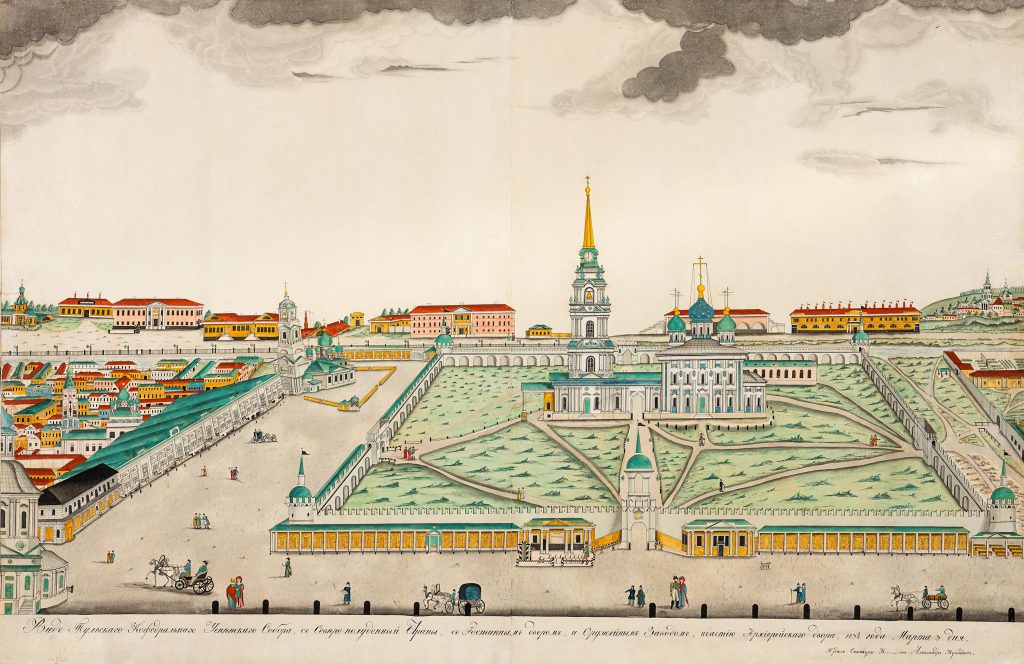 А. Муковнев. Тула, вид кафедрального Успенского собора с Гостиным двором и Оружейным заводом. 1834 г. Б., акв., тушь. ГИМ.