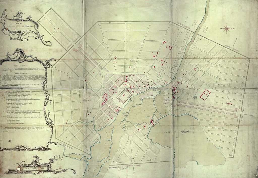 Это уже столичный вариант. В основном он следовал тульской задумке, однако новый торг дистанцировался: малозаселённое подножье Петровской горы участливые проектанты посчитали для него более уместным – домов меньше ломать. Центростремительная трёхлучевая структура подверглась инверсии: теперь три улицы устремлялись не к крепости, а от неё (дороги на Воронеж, Калугу и Киев). Столица словно бы намекала на собственное устройство: та же тройственная развилка с Невской перспективой во главе начиналась от Адмиралтейства и лежащей за ним реки.