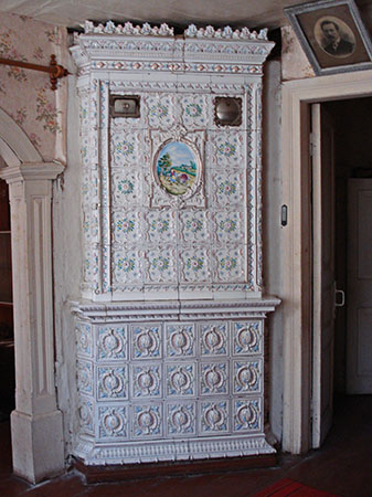Художественной особенностью печки является наличие в центральной части декоративного панно «Птичница», выполненного в технике «декалькомания» – многоцветной печати, полностью имитирующей ручную роспись. Эта техника была изобретена во Франции в1880-х гг., впервые внедрена в производство в России в 1900 г. М.С. Кузнецовым на заводе в Дулёво. М.С. Кузнецов с 1892 года и до 1917 являлся монополистом в России в производстве частного фарфора, имел 18 предприятий. В России многоцветную «деколь» дорабатывали вручную. Было закуплено 900 сюжетов, имитировавших росписи фарфора ХIХ в. – романтические и пасторальные пейзажи. В то время в моде были нежные акварельные цвета: голубой, розовый, сиреневый, кремовый. С 1912 г. деколи заказывали в Германии, преимущественно с батальными сценами, украшенные золотым штампованным орнаментом. Основными потребителями кузнецовских керамических изделий недорогих по цене, но высокого художественным уровня, были крестьяне и горожане среднего достатка.