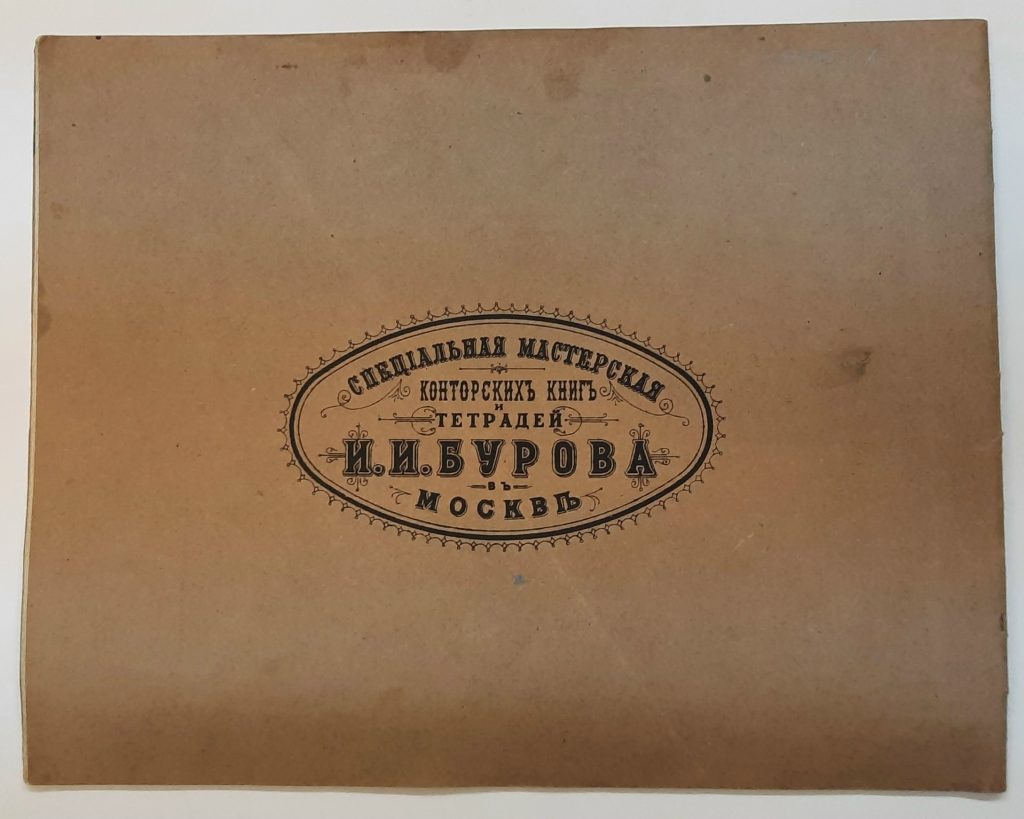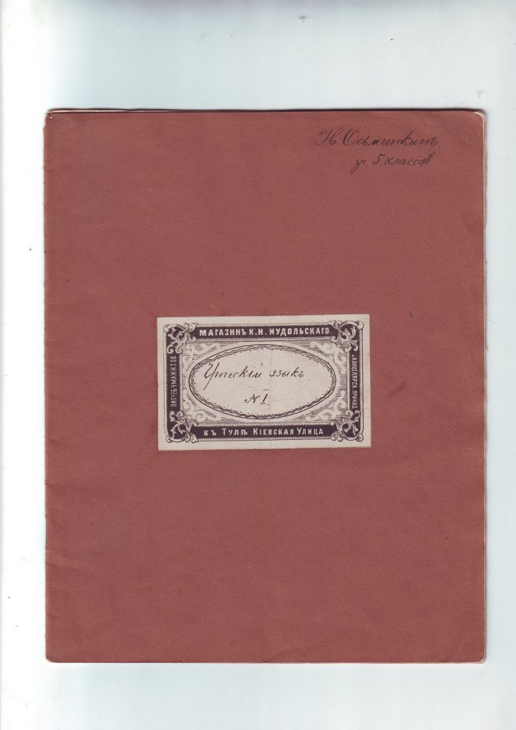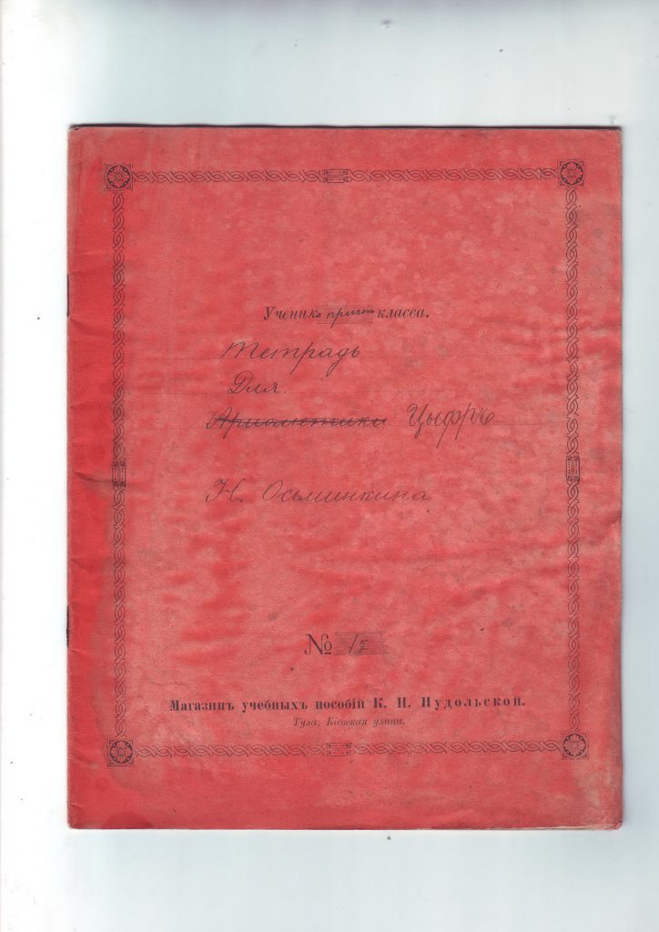 Помимо тетрадей, как мы увидим далее, учёба сопровождалась массой иных канцелярских писчебумажных товаров (принадлежностей), необходимых гимназисту, – свидетельствами, экзаменационными листами, классными журналами, ведомостями, аттестатами зрелости и т.д. Приобрести всю эту продукцию можно было в различных торговых домах в отделениях канцелярских принадлежностей, либо в небольших книжных и писчебумажных магазинах. На тетрадях Николая Осьминкина мы читаем – «Магазин учебных пособий К.Н. Нудольской. Тула, Киевская улица», «Специальная мастерская конторских книг и тетрадей И.И. Бурова в Москве», «Писчебумажный магазин В.М. Львова. Бывший «Новости», «Магазин И.Ф. Зотова в Тамбове. Писчебумажное товарищество и канц. принадлежностей», «Писчебумажный магазин Львова в Туле».