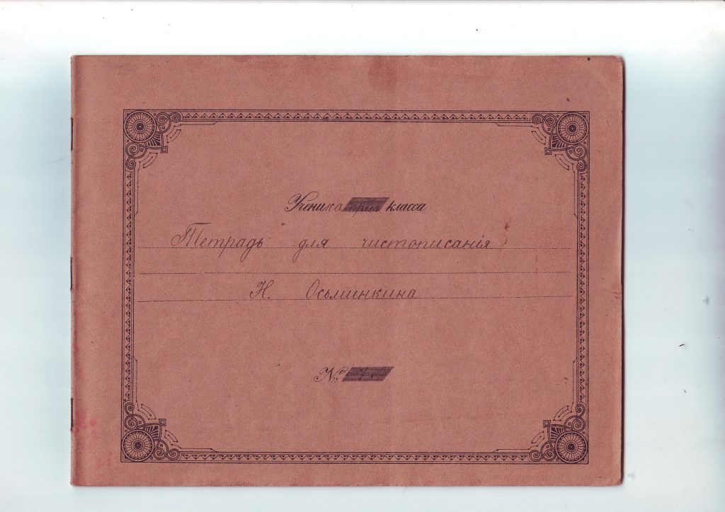 Размеры 22,4х17,6 см. Обложка из плотной бумаги светло-коричневого цвета. На передней стороне обложки пропечатана орнаментированная рамка для надписи из 3х строк. Тетрадь подписана черными чернилами: «Тетрадь для чистописанiя Н. Осьминкина». На задней стороне обложки напечатано клеймо фабрики в орнаментированной овальной рамке «Спецiальная мастерская конторскихъ книгъ и тетрадей И.И. Бурова въ Москве». Листы тетрадки в узкую и широкую линейку с наклонными линейками. В тетради 14 листов, исписанных черными чернилами.