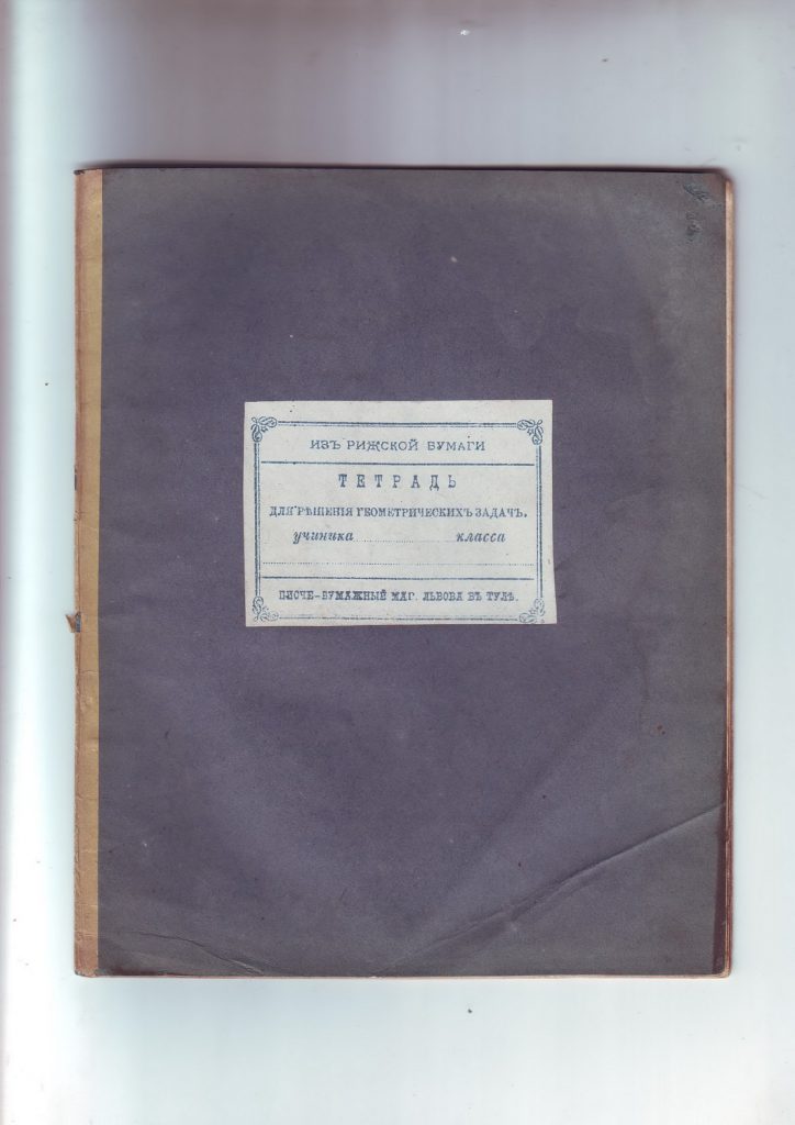 Среди них тетради по арифметике, чистописанию, русскому языку, греческому языку (Гораций и Софокл), для решения геометрических задач, классных упражнений по физике и космографии, домашних упражнений по алгебре. Для списывания, для диктанта немецкого, для диктанта русского. Это тетради, выпущенные типографским способом в тульских и иных типолитографиях.