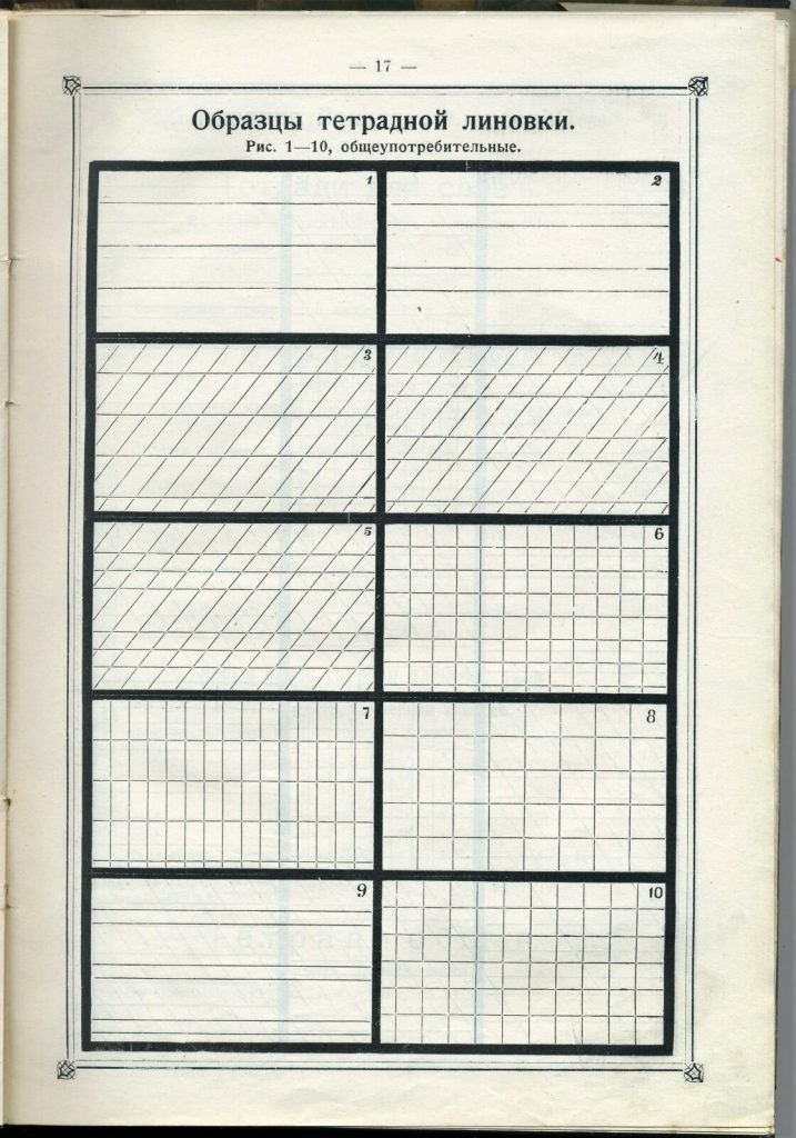Для французского, немецкого, греческого, латыни существовали тетради со свой линовкой, да ещё и отдельно с наклонным и прямым письмом. Для различных ступеней обучения также предназначалась своя линовка. Основным назначением линовки всё же была выработка у учащихся начальной школы навыка красивого письма и каллиграфического стиля. К 1914-му году типов «линевок» было не менее 25.