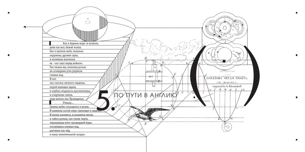 «Графическим ключом и поводом к книге стали чертежи из брошюры «Описание роторного парового двигателя «Московка», изобретённого А.С. Хомяковым», отпечатанной по-английски в Лондоне к Всемирной выставке 1851 года. Хомяков, которого мы знаем как философа-славянофила и романтического поэта, был также незаурядным изобретателем и прожектёром.