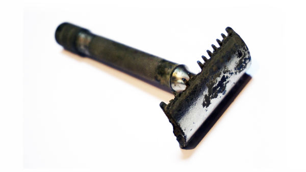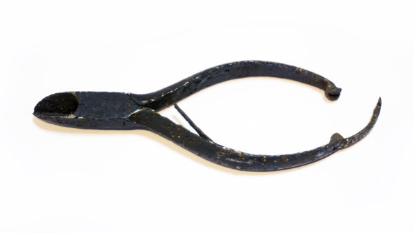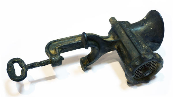 Нож для вскрытия писем с ножнами, щипчики и пилка для ногтей, флаконы из-под одеколона, фрагмент «кости» домино, мясорубка, перьевая ручка (вермахт)