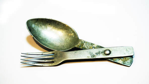 В комплект снаряжения красноармейца также входили алюминиевые котелок и ложка. Однако если была возможность, солдаты предпочитали домашние столовые приборы. Считалось, что эта часть малой родины – своеобразный талисман, который поможет скорее покончить с войной и вернуться домой. Чтобы придать стандартным ложкам индивидуальность и не перепутать, на них наносили гравировку, выцарапывая или выбивая инициалы, год рождения, иногда надписи-лозунги. Размер ложки и конструкция котелка предполагали, что первая вкладывается внутрь второго, что позволит сэкономить место в вещмешке и убережёт ложку от потери. Но на марше ложки гремели бы в котелках, поэтому их носили в вещмешке или засовывали за голенище сапога.
