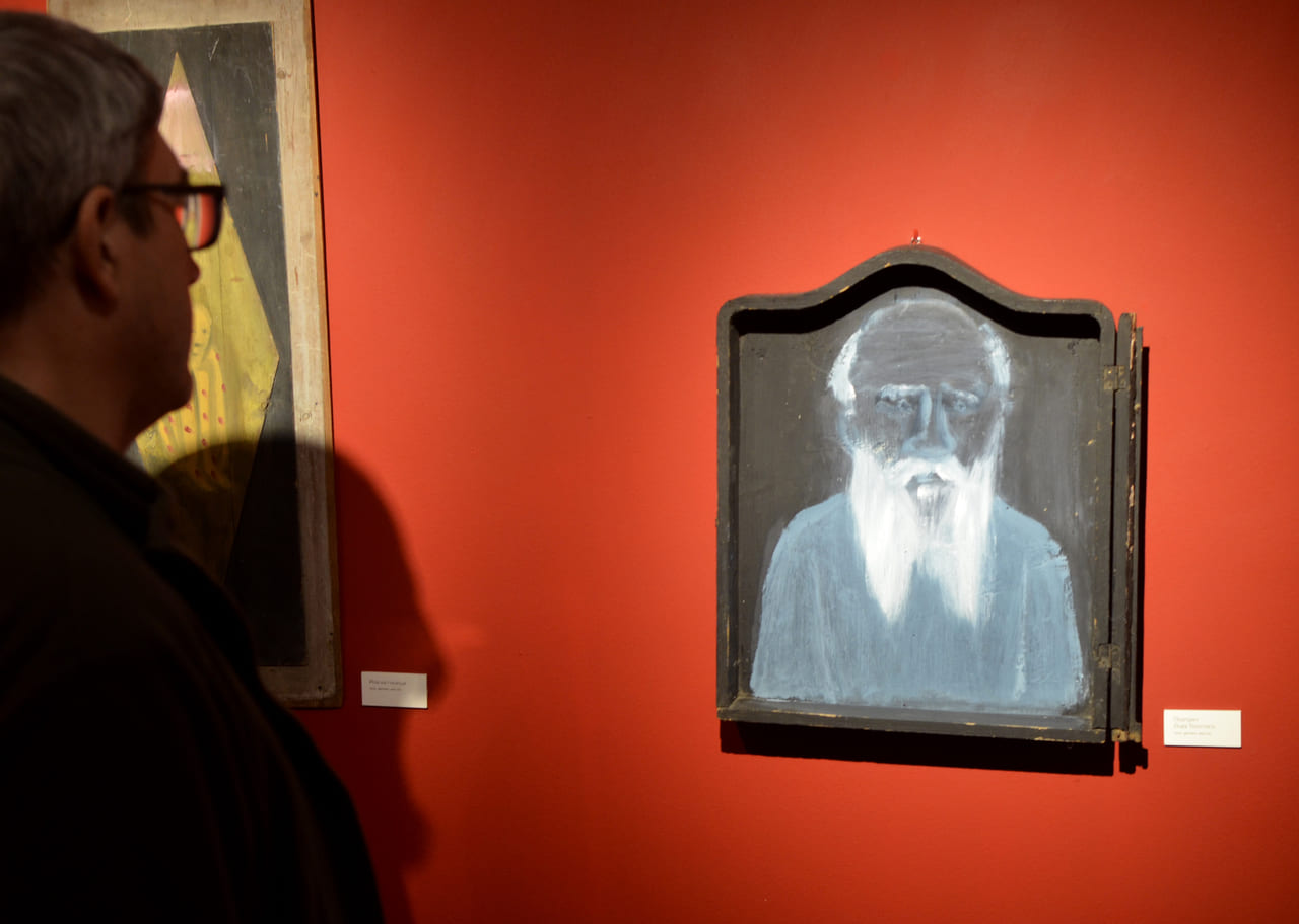 «Антики» – так определял Лесков некоторых странных своих персонажей. Всё-то в этих его историях не по правилам: «словечки» из деформированной (на фоне канонизированного литературного языка) речи рассказчика, внерациональное поведение нелепых героев, опять же «неправильных» с точки зрения житейской практичности или формальных государственных установлений. Затуловские дощечки и жестяночки – те же антики: странные, тяжело пожившие и сперва неприглядные. Но едва свыкнешься с ними, едва освоишься в их присутствии, — принимаются бойко рассказывать, и тоже ведь в обход канонизированной речи, не по законам изысканной беллетристики и не по канонам станковой живописи. Ирина Затуловская – и «художный» мастеровой, и бытовой историк, и совершенно «не эстет». Её работы тоже: то веселят душу, а то бередят. Берёт первые попавшиеся «нелепости древнего быта», украшает-то их, кажется, слегка, а на выходе – полноценный Художественный Образ, иногда просто переворачивающий твоё мировосприятие; откуда что берётся.