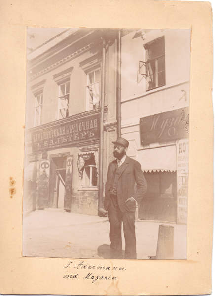 Фридрих Адерман (1863 – 1914). Супруг Ольги. Родился в семье прибалтийских немцев. Младенческие и отроческие годы провёл на острове Эзель в Балтийском море (ныне – Сааремаа, Эстония). Выпускник Дерптского университета. Магистр фармации. Мечтая о научной карьере естествоиспытателя в Германии, встретил свою судьбу в Туле. После смерти тестя Фердинанда Белявского стал так талантливо руководить его аптекой, что окончательно её прославил. Многосторонняя личность. Увлекался фотографией и астрономией, играл на цитре и много читал. Был сведущ в микробиологии, ботанике и минералогии. Его внезапная ранняя смерть вызвала не только оцепенение и скорбь близких, но повергла в глубокую печаль едва ли не весь город, во всяком случае, ту его часть, которую принято называть «культурной общественностью».