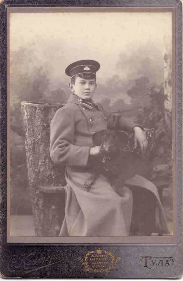 1908 год. Ученик первого класса Тульской гимназии Гори Адерман. Фотография сделана в двух шагах от родительского дома, на той же Киевской, в ателье Семёна Кантера. Гори горд своим новым статусом, но это не умеряет его привязанности ко всему домашнему: на коленях у него позирует любимец семьи, такса Даксик. Сама его кличка – свидетельство крепости русско-немецких культурных связей рубежа веков. Такса, нем. «Dachshund» («dachs», барсук + «hund», собака). И ещё один плюс — русский сентиментальный суффикс.