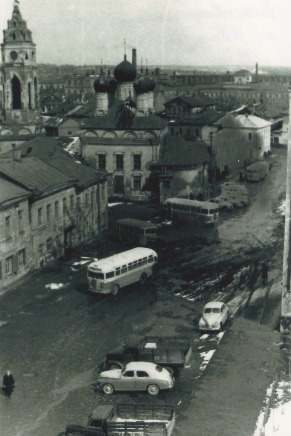 Автор этих строк еще застал автостанцию, которая размещалась прямо возле стен храма. Появилась она, видимо, еще в 1930-е. Здесь была конечная остановка маршрутов в Щекино, Первомайский, Венев, в шахтерские города и поселки на востоке области… На фото хорошо виден классический для тех лет автобус ЗиС-155, неспешно выезжающий на площадь Челюскинцев. Спроектирована эта машина была сразу после Великой Отечественной, с оглядкой на американские автобусы 1930-х. Налицо все узнаваемые элементы – небольшие раздвижные окна, над которыми расположены маленькие овальные окошки, широкий подоконный пояс, плоские лобовые стекла, наклоненные назад так, что их верхняя часть глубоко утоплена в передок кузова, массивная центральная часть облицовки радиатора… Солидно, добротно, хотя для 1950-х уже старомодно. Красили такие автобусы обычно в два цвета – красный или зеленый низ, желтый или белый верх. Выпускались ЗиС-155 с 1949-го по 1957-й, и сделали их не так уж мало – 21 тысячу штук.