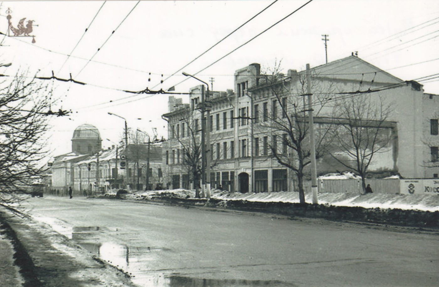 Что же касается пятиэтажки, которую мы видим на переднем плане снимка, то моему поколению она известна под названием «Дом обуви». Когда-то так называлась и ближайшая к ней остановка троллейбуса. Дом представляет собой частый образчик провинциальной архитектуры второй половины 1950-х. Этажи со второго по пятый – жилые, облицованные кирпичом кофейного цвета, с низенькими потолками, смежными комнатами и совмещенными санузлами. Первый этаж предназначен для размещения магазина и отмечен несколькими «последними выдохами» эпохи излишеств: оштукатурен, покрыт рустовкой, а арка, ведущая во двор, имеет полукруглое завершение. Видимо, для тогдашних архитекторов еще было немыслимо выставить на одну из главных улиц городского центра типовое, ничем не украшенное страшилище. Кстати, боковое крыло того же дома, выходящее на Денисовский переулок, не было покрыто ни облицовкой, ни штукатуркой – с первого этажа по пятый голый кирпич мерзкого оранжевого цвета. Нынешний красный цвет оно приобрело уже в XXI веке. Благодаря этому фото мы можем видеть, что изначально для магазина были спроектированы узкие вертикальные витрины – такой рисунок остекления торговых объектов был популярен еще в довоенные годы. В 1980-х, когда в доме размещался обувной магазин, там уже были обычные советские витрины из больших, почти квадратных, стекол. Появились они, по-видимому, в начале 1970-х. Нынешнему огромному остеклению, отобравшему у пешеходов часть тротуара, нет и пятнадцати лет, а его инициатор, крупная торговая сеть, благополучно обанкротилась.