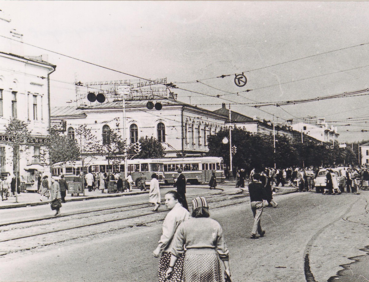 И еще один маленький штрих – расположение трамвайной остановки. На фото четко видно, что она находится напротив здания бывшей гимназии – об этом свидетельствует табличка, подвешенная к растяжкам контактной сети. В те годы не существовало линии по улице Коминтерна, и трамваи в сторону Московского вокзала ходили так же, как в 1927-м – посередине улицы Красноармейской, еще не ставшей проспектом. В том числе и трамваи маршрута № 6, который в те годы связывал Заречье с Московским вокзалом, и вот ему-то сразу за остановкой нужно было повернуть направо. Ближе к фотографу – состав из вагонов КТМ-1 и КТП-1, работавших в Туле с конца 1940-х до начала 1970-х. Выглядели они очень привлекательно: низ темно-красный, верх светло-желтый, единственная фара на передке кузова обрамлена хромированным сиянием в форме пятиконечной звезды, бампера – тоже хромированные. Далее виден поезд из двух стареньких вагонов – моторного Х (такие вагоны некогда открывали движение в Туле) и прицепного М.