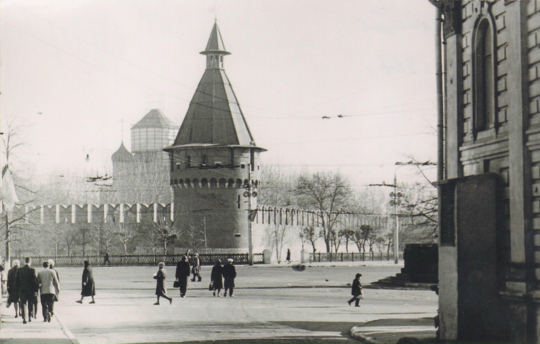 Снимок сделан почти ровно по оси Денисовского переулка, точка съемки находилась между Дворцом пионеров (его край виден в правой части кадра) и зданием, которое в 1930-х называлось Дворцом труда. Автомобильное движение в переулке о ту пору было двухсторонним, но машины там проезжали, без преувеличения, хорошо если раза два в день, так что фотограф мог не опасаться случайно подкравшейся легковушки. Левее угла здания Дворца пионеров просматривается краешек постамента памятника Труду и Обороне. Фотография очень наглядно иллюстрирует, как изменился внешний облик площади Челюскинцев меньше, чем за десять лет – с конца 1950-х до второй половины 1960-х. Кремль зрительно стал намного выше и словно бы выпрямился. Эффект этот сугубо визуальный – даже в худшие для крепости годы стены и башни не отклонялись от вертикали ни на градус. Несмотря на то, что выстроен Кремль в низине, у реки, на сильно заболоченной почве, за долгие века он не дал сколько-нибудь существенной осадки. Секрет итальянских мастеров весьма прост: в материковый глинистый грунт было вбито огромное количество дубовых свай, на которые, в свою очередь, опирались мощные фундаменты, сложенные из белого камня – благо в окрестностях тогдашней Тулы и дубов, и известняка было предостаточно.