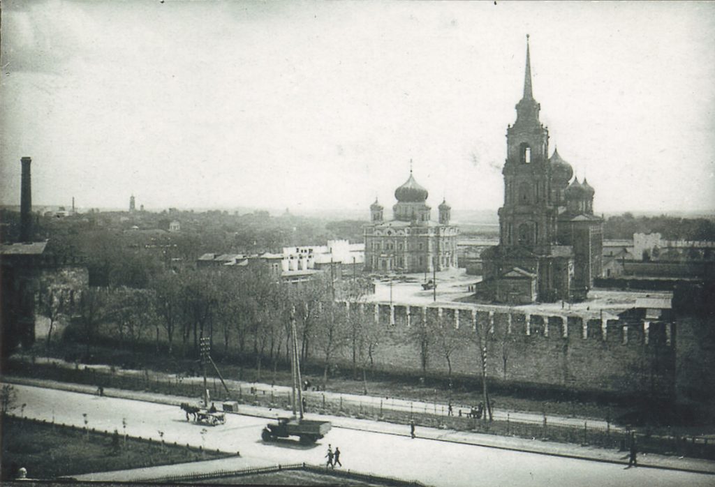 За Успенским собором просматриваются деревянные строения стадиона «Зенит», открывшегося в 1929-м. Именно здесь в течение трех десятков лет рос и развивался тульский футбол. Верхнюю же временную границу снимка можно определить по упоминавшейся выше колокольне. Вечером 28 сентября 1936 г. на ее верхних ярусах начался пожар. Потушить огонь не было никакой возможности – напора пожарных насосов не хватало, чтобы подать воду на 70-метровую высоту. Случись несчастье лет на тридцать пораньше, поврежденные этажи быстро восстановили бы лучше прежнего. Советская же власть воспользовалась этим предлогом, чтобы быстренько снести наследие старого режима, что и было исполнено к весне 1937-го. От колокольни остался лишь мощный фундамент, на котором она и была воссоздана семьдесят семь лет спустя.