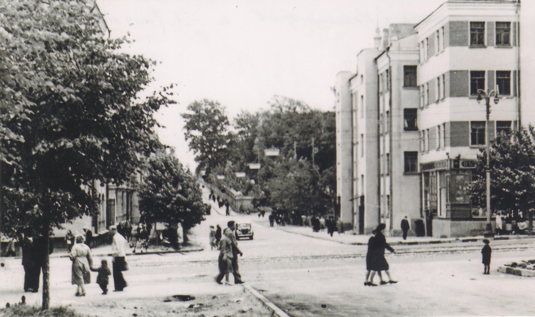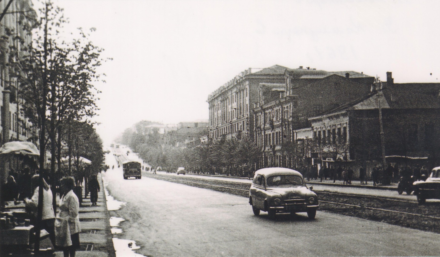 Но глядя на снимок, на эту шумную летнюю суету, думать о грустном совсем не хочется. На улице Коммунаров зеленеет множество деревьев, граждане спешат по своим делам, иногда останавливаясь, чтобы выпить стакан газировки – тележка с нею видна в левой части кадра. Я еще помню продавщиц в белых куртках, которые ловко орудовали двумя рукоятками, одна из которых управляла подачей собственно газированной воды (стакан – копейка), вторая – сиропа (с сиропом стакан стоил три копейки). Особенно любившие сладкое могли заплатить пять копеек, и тогда добрая тетя набирала в стакан из вертикальных стеклянных трубок аж две порции тягучего яблочного или грушевого сиропа. Такая газировка называлась «с двойным сиропом», и далеко не все мальчишки подозревали о ее существовании.