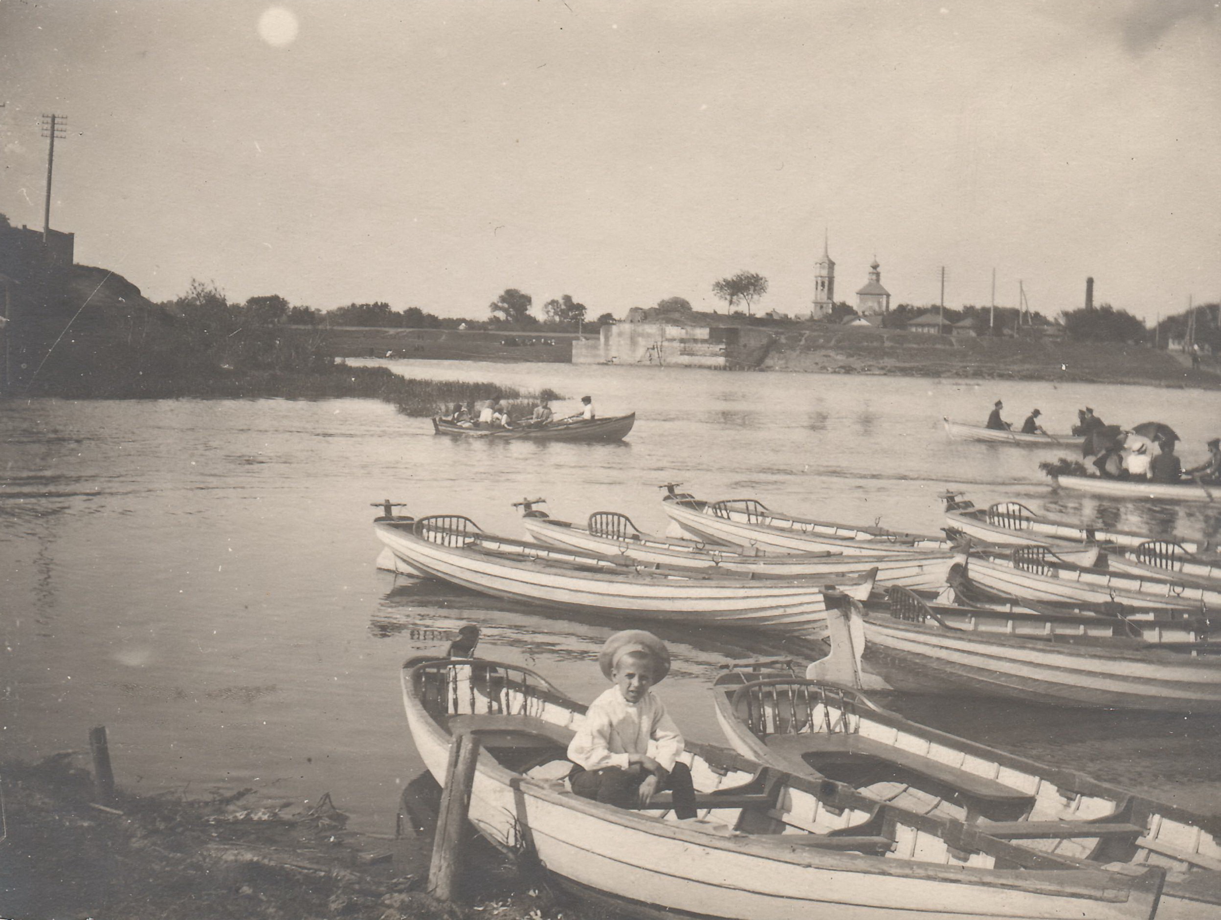 Недалеко от места, где сейчас высятся быки старого Чулковского моста, фотограф запечатлел еще одну тульскую достопримечательность начала ХХ века – лодочную станцию. Ну то есть станцией она, скорее всего, не называлась, а просто некий предприимчивый господин открыл на левом берегу сдачу лодок напрокат. Казалось бы, в старой России было множество прибрежных городов с развитым судоходством – от Ревеля и Петербурга до Нижнего и Астрахани, но нигде, ни в одном музее я не встречал подобного снимка. Это единственное известное мне историческое фото, на котором можно подробно рассмотреть, как выглядели такие – прокатные – лодки. Судя по единообразному виду, закуплены они оптом, и произведены, скорее всего, далеко от Тулы – может быть, на Волге, а может, и в Финляндии. В общем, там, где есть дешевый лес и много воды. В начале ХХ века практически любой груз можно было доставить по железной дороге в любую точку империи за умеренные деньги, а таких лодок в товарный вагон войдет довольно много.