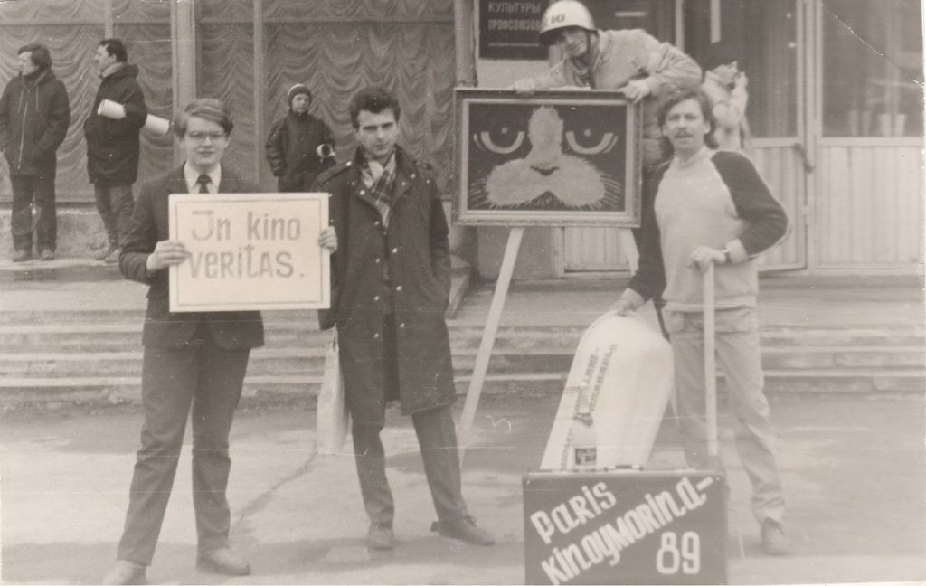 Здесь вы можете видеть, фотография посвящена конкурсу любительских кинокомедий, который назывался «Киноюморина», проходившему в Туле в апреле 1988 года. Ваш покорный слуга – крайний с плакатом «In kino veritas» — немножко перефразированный латинизм. Я тогда заканчивал 10-й класс. Правее меня стоит Игорь Валентинович Манцов. Те, кто следит за публикациями о нашем книжном магазине, тот его знает, позже он стал профессиональным кинокритиком, а в те годы он возглавлял киностудию «Сад». Такой вот он здесь, немножко мечтательный юноша. Сейчас ему, конечно, уже немножко больше лет. Но в целом похож! На лестнице стоит Артур Кагальников – мой одноклассник. Мы с ним 2 года подряд просидели за одной партой. И самый крайний справа – это Владимир Ильичев. Работал в ДК Профсоюзов, потом увлекся человек туризмом и пропал для общества – стал заядлым туристом! Честно говоря, давно его не видел.