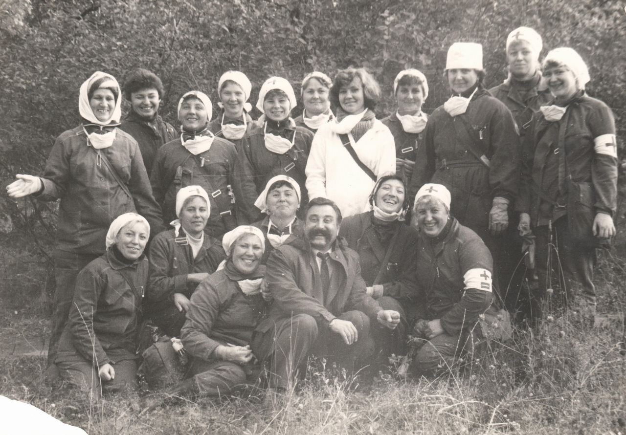 Ох, ну это шикарный сюжет. Кто-нибудь из участников известен? (Ответ Анастасии: Да, на снимке моя бабушка. Во втором ряду слева). Здорово! Это у них, между прочим, не маски. Это называлось «респиратор ШБ-1 Лепесток», так называемый. И в изобилии они были где-то в конце 70-х – начале 80-х, верно? (Ответ Анастасии: Да, примерно этот период на фотографии). Противогазы на лямках с характерными прямоугольными пряжками. И еще один очень показательный элемент. Видите, у них повязки с красным крестом. И у одной женщины в первом ряду, у той, что крайняя справа, на повязке две полоски. Эти полоски – знаки различия гражданской обороны. Абсолютно официально установленные Приказом по гражданской обороне. Это так называемая санитарная дружина. Тогда, в те времена, очень активно готовились к глобальному конфликту, и такие сандружины формировались на предприятиях повсеместно. У меня мама, например, тогда работала в ЦНИИСУ. У них тоже была такая сандружина. Им тоже выдавали, по-моему, даже какие-то комбинезоны, эти респираторы Лепесток, повязки и противогазы. И они куда-то на сборы ездили, то ли в Кураково, где полк химзащиты. То есть это были, как бы сейчас сказали, тренинги или учения.