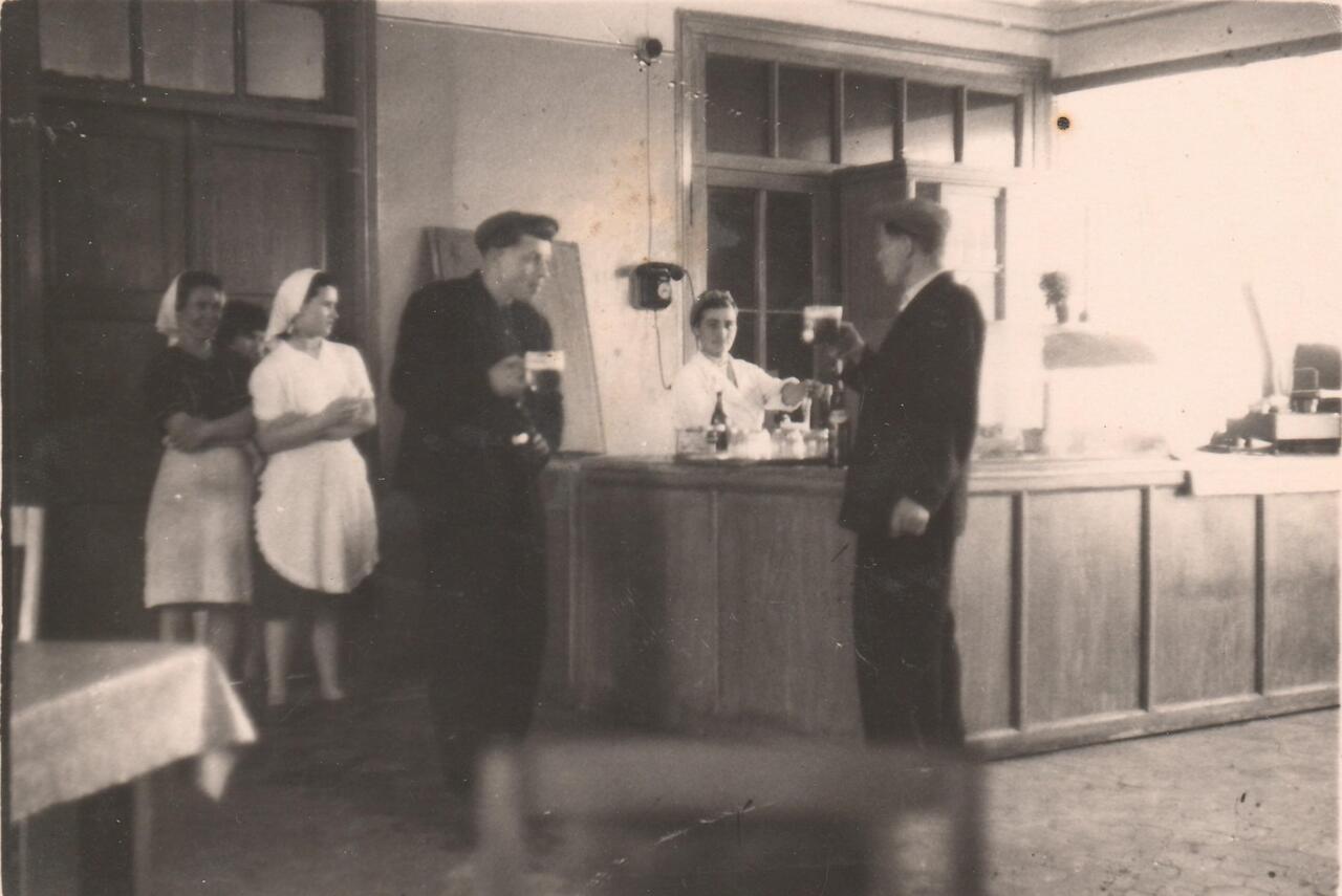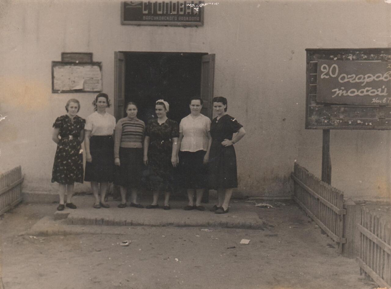 Тоже лето или ранняя осень. Скорее лето, короткий рукав (Комментарий из зала: урны у входа никакой нет). Не было такой культуры у нас тогда (Комментарий из зала: Она, скорее всего, внутри. Курили ведь тогда везде). Да, курить не запрещали. Как же запретить работяге курить – это перебор! Помню, луч проектора в кино и клубы дыма. Точно-точно, было-было. Столовая барсуковского рабкоопа. Вообще, кооператив это же нечто схожее с акционерным обществом. То есть в нем есть разделение на паи. И если кооператив работает с прибылью, даже начислялись какие-то платежи. Я не помню, как это называлось. Можно было в дополнение к зарплате что-то поднять.