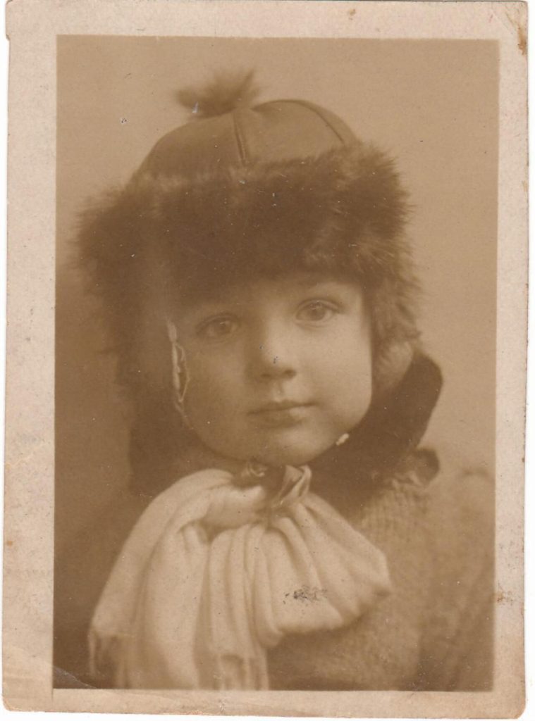 Шапка, такое впечатление, что от бабушки осталась. Но фасон довольно нетипичный для тридцатых годов. Тогда «финки» были в ходу. Просто ребенок из 1935 года… В заказной шапке. (Комментарий из зала: Кажется, это фото сделано в студии). Ну да, пусть небогатое, но какое-то фотоателье. И постановка присутствует. Кстати, здесь присутствует работа со светом, обратите внимание. Светотональное освещение, здесь нет резких теней на лице, но фактура лица проработанная. Это не так просто сделать, я вас уверяю. Да, это совершенно справедливое замечание, что снимок студийный. Ну, видимо, небогатая студия. (Комментарий из зала: Может и одежда была предоставлена фотостудией: шапка, шарф). Может быть и да. Но главное, что общая композиция студийная: наклон головы небольшой, взгляд не непосредственно в камеру, а куда-то чуть в сторону.