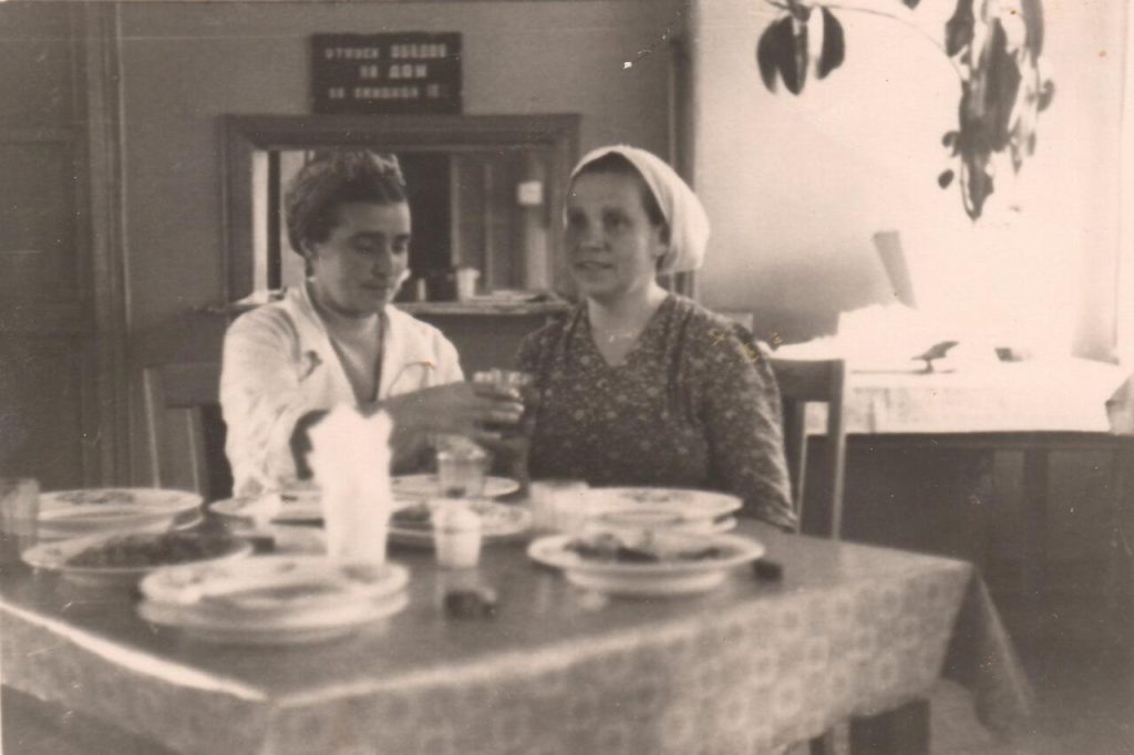Так, а что там у нас написано-то… «Отпуск обедов на дом»! Вот когда оно было-то ещё! (Вопрос из зала: Доставка?). Да нет, это самовывоз, это не доставка. Еда с собой, да. А клеёнка, посмотрите, какая! Из тех, которую домой приносишь, от нее несколько дней пахнет химией. Обычно даже на балкон иногда вешали, чтобы выветрилась. Обязательно стакан большой с салфетками, в середине то ли солонка, то ли перечница. И, кстати, на заднем плане тоже не весы ли? Может что-то типа контрольных весов. Какие-то тропические растения висят (Вопрос из зала: В это в окошко выдавали обеды, да?). Ну, получается, да (Комментарий из зала: А рядом обычно было окошко для приема грязной посуды.). Да, рядом с пищеблоком была мойка.