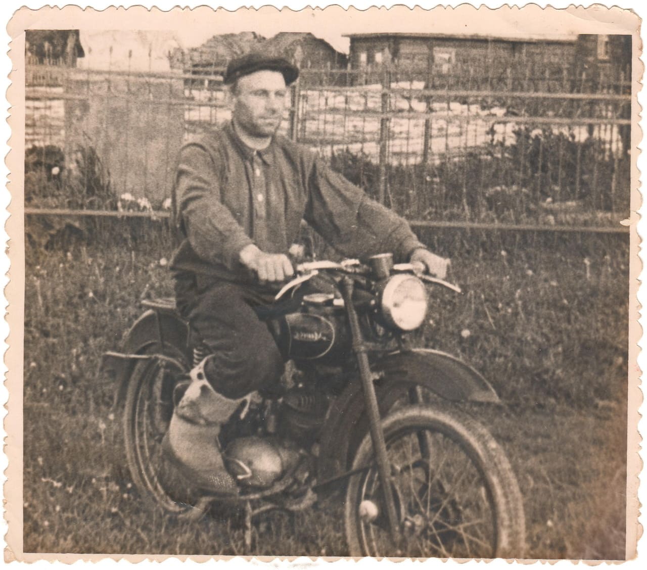 Это послевоенная фотография, может быть, 50-е – начало 60-х. Но для тех времен мопед — целое богатство. Моторизованное такое средство передвижения. И вот этот стиль — глубокие крылья, такой каплевидный бак. То есть «я тоже мотоцикл, только я маленький мотоцикл». Вот такой стиль лично мне гораздо ближе, чем мопеды 80-х годов, какие-то стилизованные полуспортивные. Очень стильное фото, такой хозяйственный мужик крепкий чувствуется, не старый еще. Приятно посмотреть.