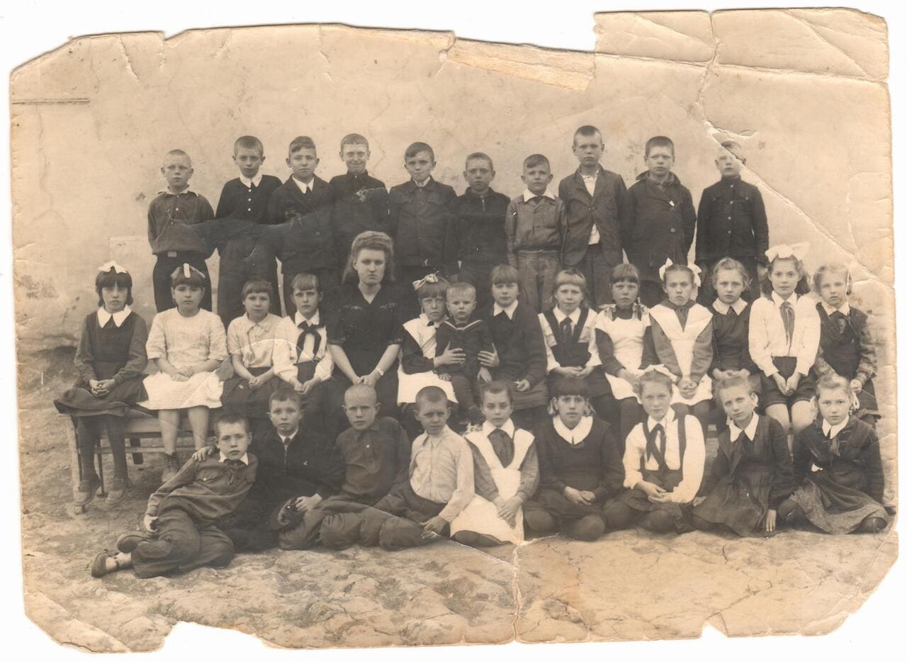 Это у нас школьная фотография, сдается мне, что это где-то конец 1940-х. Основная зацепка для датировки – это образ учительницы: ее причёска, платье – это что-то в духе конца 40-х – может быть, 50-е годы. Кое у кого школьные блузы, видите, белые такие воротнички нашиты сверху и светлые пуговицы – это школьная форма. Даже у одного мальчика в верхнем ряду, крайнего слева бляха форменная. Были такие форменные бляхи, на них был выбит венок и буква «Ш» — школа. Это подражание дореволюционным, еще гимназическим бляхам с гербом гимназии или с аббревиатурой.