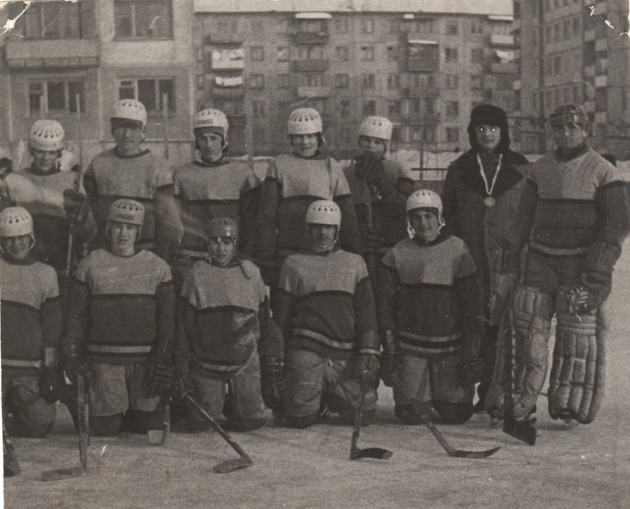 Это явно дворовая хоккейная коробка. Шлемы, я помню, такие в спорттоварах продавались. У них подшлемника как такового не было, он очень дохлый был. Надевали их обычно на шапку-ушанку или на вязанную шапку. Вот здесь видно, что они поверх шапок надеты. Но здесь ещё хорошо, что им удалось в спорттоварах единообразную форму купить и щитки вратарские. То есть это дворовая команда, но серьёзного уровня. Это люди, которые друг друга знают не первый день. Молодые ребята, пацаны, скорее всего, объединившиеся по месту жительства, а не по месту общей учёбы. Это было время, когда ещё во дворах в хоккей играли, самый настоящий хоккей с шайбой.