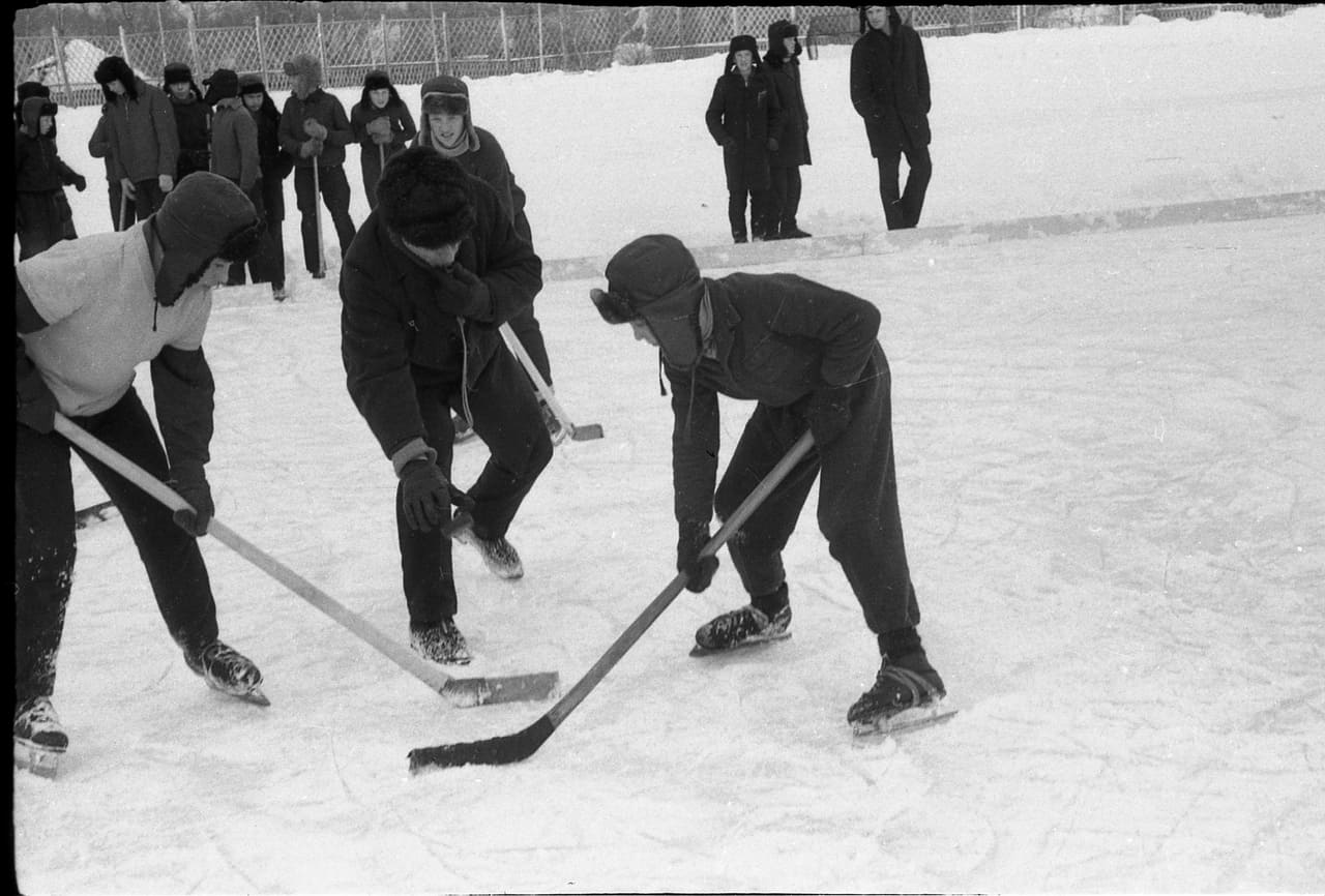 Тут, кстати, по-моему, вратарь у них достаточно по возрасту выделяется, мне кажется, да? Справа. Дело в том, что шайбу-то гонять проще, а вот на воротах-то стоять – это надо хоть какую-то подготовку иметь. Кстати, помню я, как в таких щитках достаточно профессиональные хоккеисты играли, хоть и выглядят они несерьезно. Вообще, мы сейчас просто не можем себе представить популярность хоккея в Советском Союзе. Если даже я, человек от спорта далекий, смотрел всегда от звонка до звонка чемпионат мира и известенский турнир, если кто помнит, фактически второй чемпионат мира. То есть, международный турнир на приз газеты «Известия». Ну, и победитель-то, в общем, был известен заранее. Это сборная СССР. Собственно, закат советского хоккея начался с 80-го года, когда на Олимпиаде проиграли в финале. Ну ладно бы канадцам, проиграли американцам, которые вообще никогда из себя в хоккее ничего серьёзного не представляли.