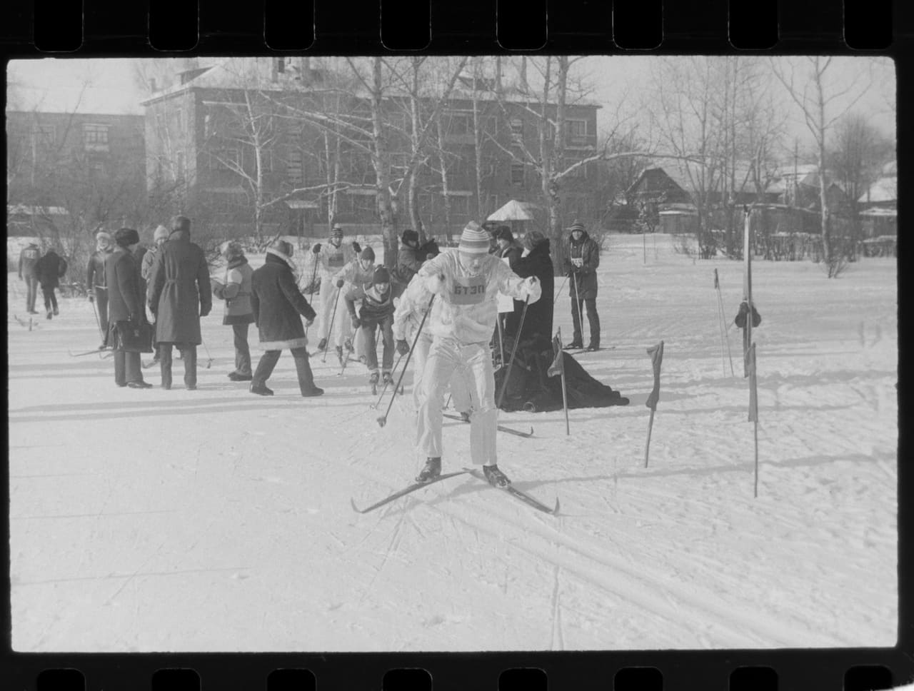А кстати, хочу еще заметить: тоже профи снимал. Зимний день, яркий, солнечный – это кошмар любого фотографа. Это свет, который лупит отовсюду, здесь явно солнце, вон тени видны, снег белый, который отражает свет, куча рефлексов, все бликует… И добиться, чтобы были видны тёмные детали, очень тяжело. Это надо понимать, как снимать, и понимать, как ещё плёнку потом проявлять. Оно, конечно, фото такое довольно серенькое, но вполне себе нормальное. Морозы ни разу не шуточные. Вот, смотрите, народ в валенках. Тогда зимы-то были не те, не как сейчас.
