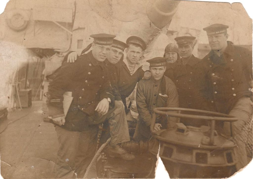 И лента. Сейчас на лентах просто пишут «Тихоокеанский флот», «Балтийский флот», то есть без конкретики. А тогда писали либо название корабля, либо название береговой части или учреждения, к которому они относились. В данном случае это курсанты военно-морского училища, проходящие практику на корабле. И вот крайний слева персонаж, это, по-моему, старшина второй статьи. У него, видите, нашивки на рукаве. Пока не было погон, вот такие нарукавники из желтой тесьмы с красными окантовками – они были знаками различия младшего командного состава на флоте.