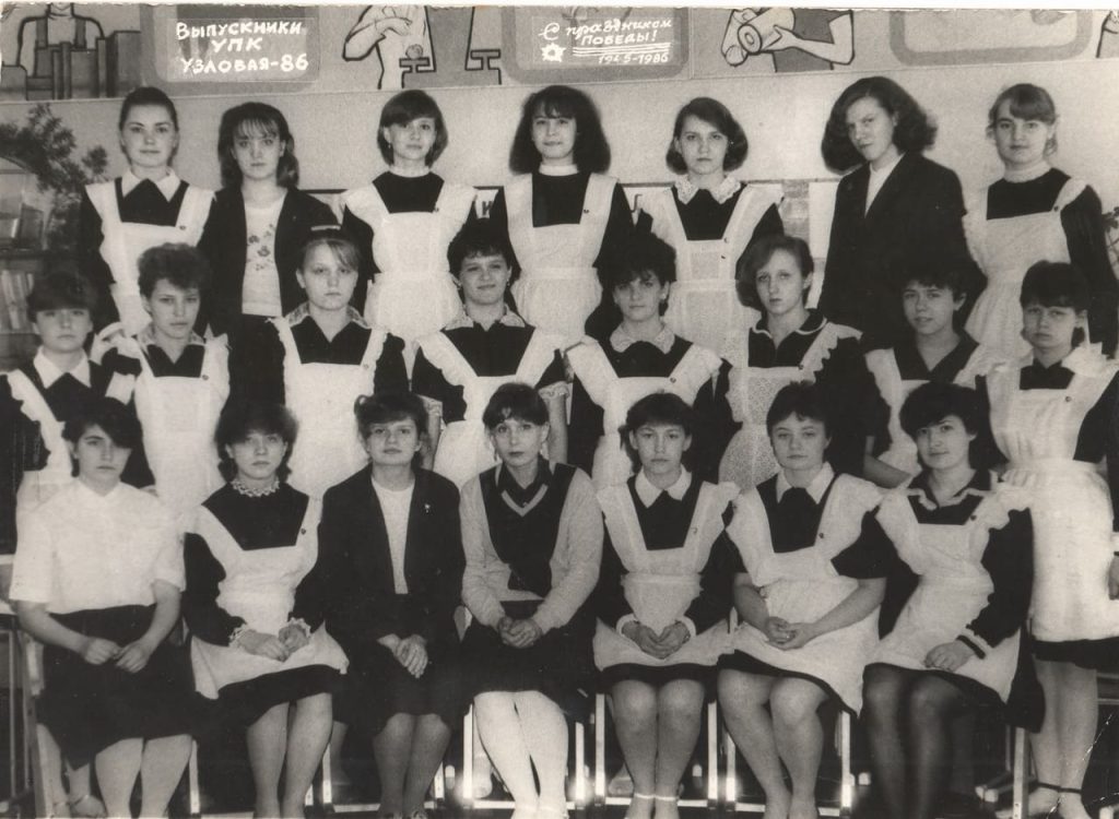 Здесь написано «выпускники УПК, Узловая 86-й год». А здесь видно, кстати, что 80-е. Во-первых, прически такие уже: лака, лака побольше. Прическа должна быть огромной, и её фиксировали.