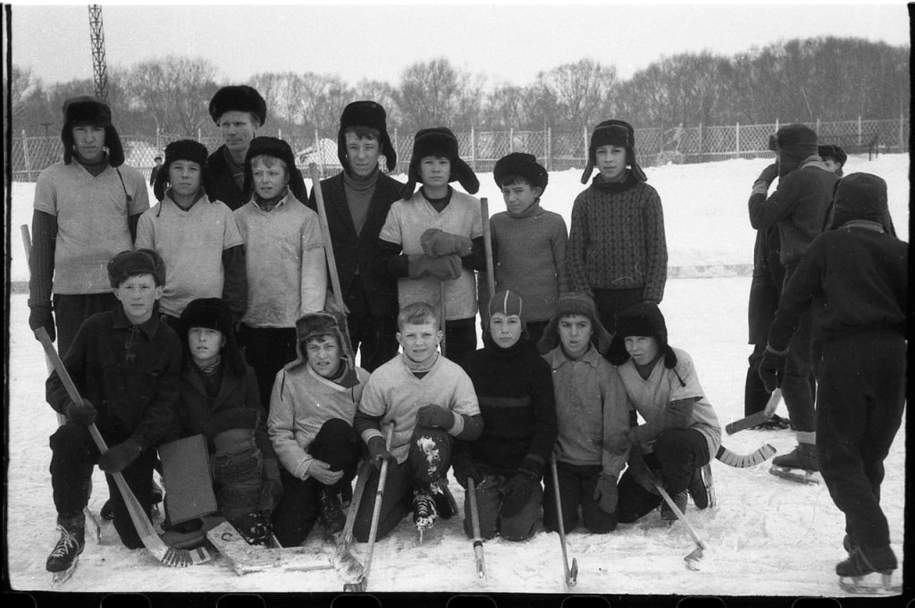Это явно дворовая хоккейная коробка. Шлемы, я помню, такие в спорттоварах продавались. У них подшлемника как такового не было, он очень дохлый был. Надевали их обычно на шапку-ушанку или на вязанную шапку. Вот здесь видно, что они поверх шапок надеты. Но здесь ещё хорошо, что им удалось в спорттоварах единообразную форму купить и щитки вратарские. То есть это дворовая команда, но серьёзного уровня. Это люди, которые друг друга знают не первый день. Молодые ребята, пацаны, скорее всего, объединившиеся по месту жительства, а не по месту общей учёбы. Это было время, когда ещё во дворах в хоккей играли, самый настоящий хоккей с шайбой.
