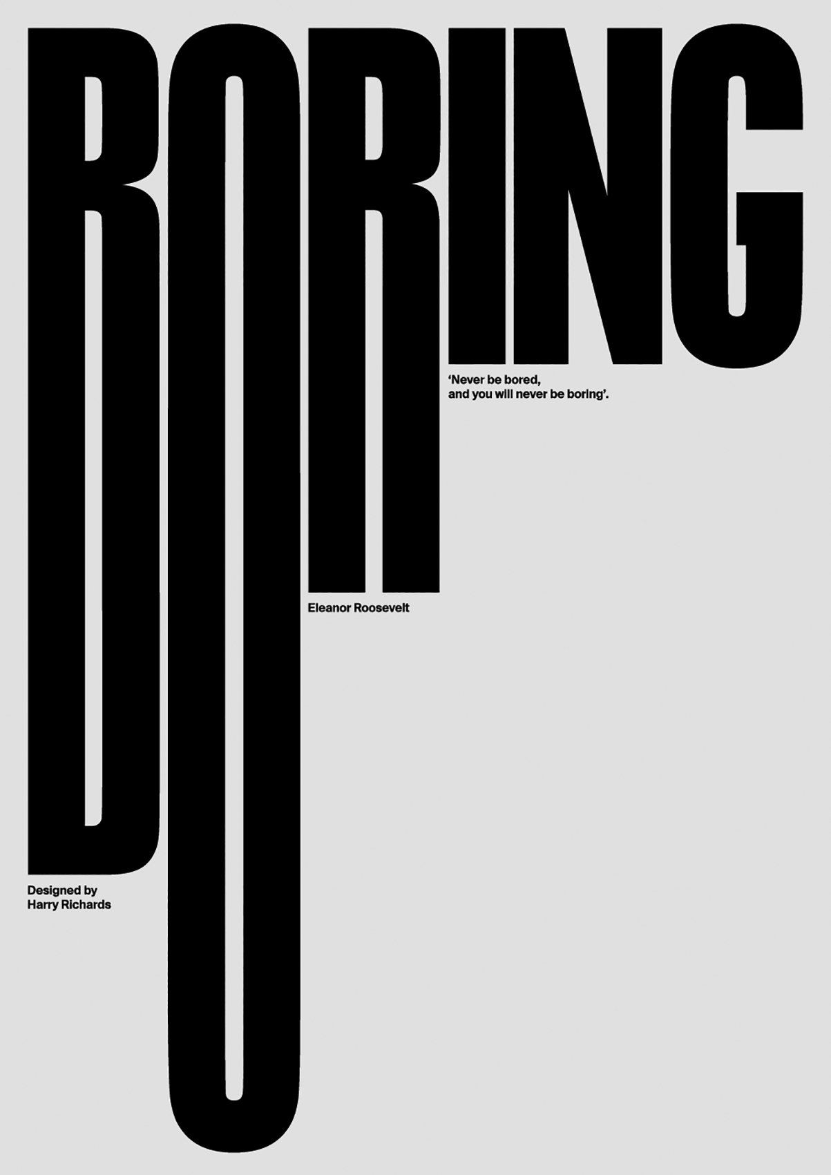 «BORING в переводе с английского означает СКУЧНО. Дизайнер Гарри Ричардс максимально удлинил букву O, намекая на зевающий рот. Такой приём в графическом дизайне называется semantic typography (смысловая, или образная, типографика)».